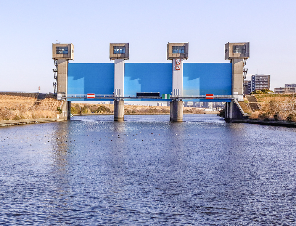 昭和57(1982)年に竣工した青水門(岩淵水門)。奥は隅田川。