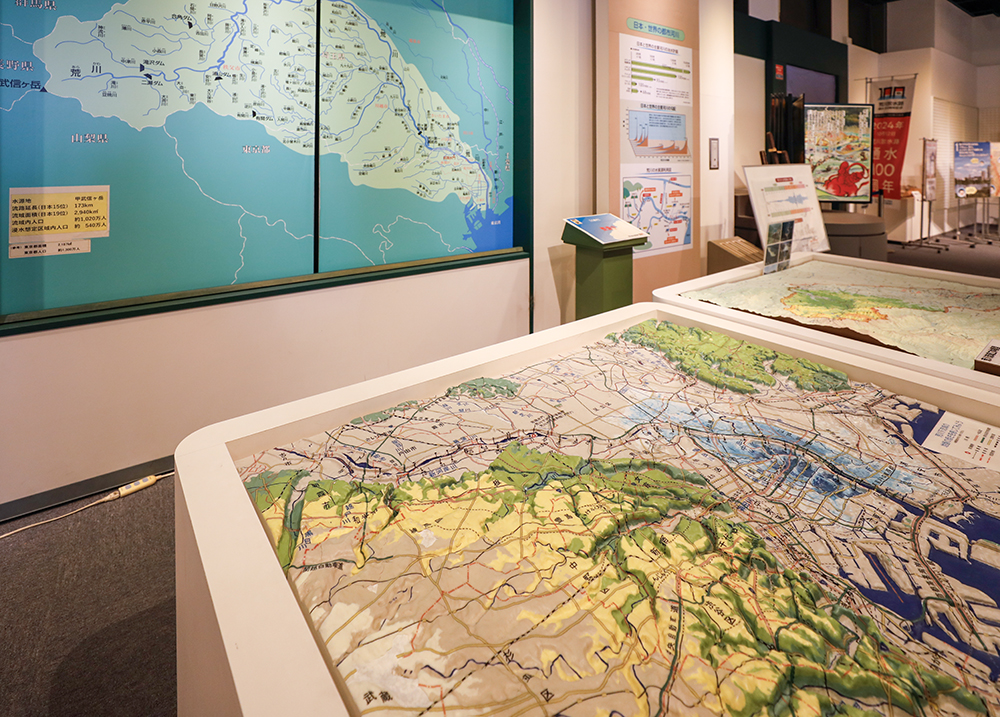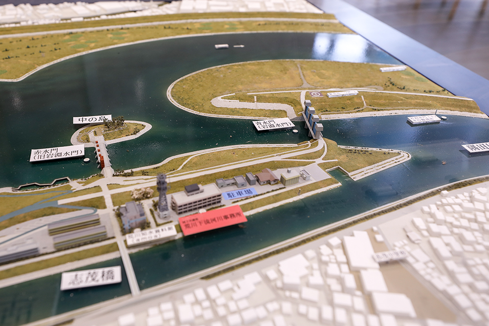 荒川知水資料館1階に展示されている岩淵周辺模型。手前右が隅田川。奥が荒川。
