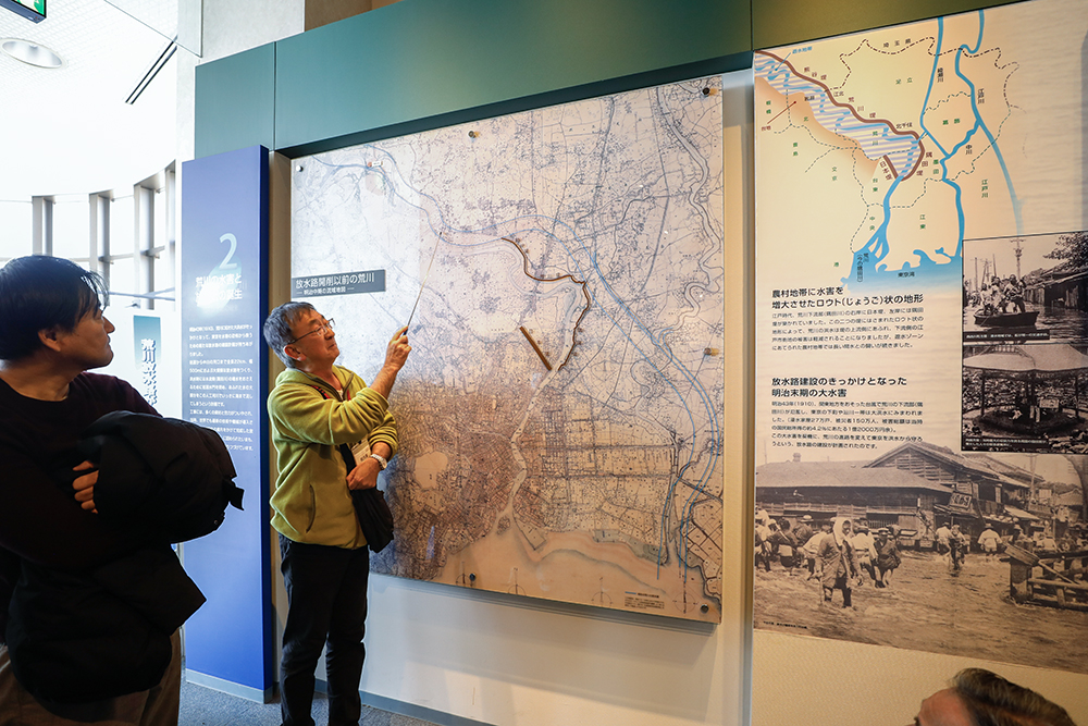 この企画は、昨年迎えた「荒川放水路通水100周年」を機に行われたものである。最初に訪れた「荒川知水資料館」では、放水路や「赤水門」(旧岩淵水門)の建設に至るまでの経緯について説明を受けた。荒川は奥秩父を源とし、北区志茂の地で隅田川と荒川放水路に分岐される。