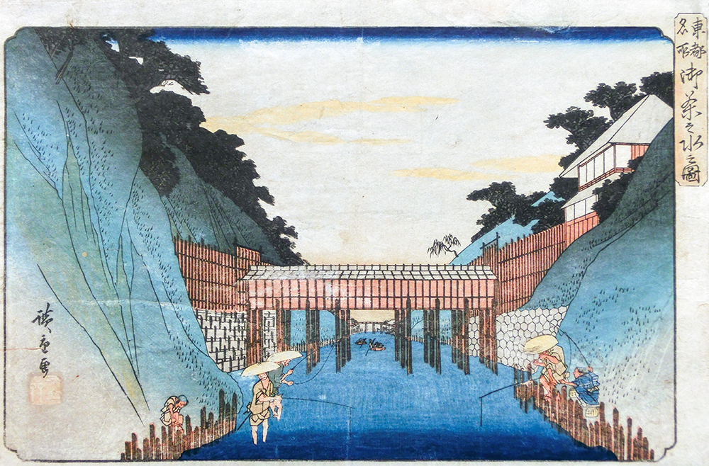 ❷ 江戸時代の「神田上水掛樋」。下流から上流を眺める。奥に見える橋は水道橋。(「東都名所 御茶之水之図」初代 歌川広重筆、紅林所蔵)