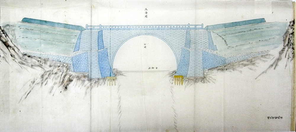 ❸ 1882(明治15)年に東京府に申請された石造アーチ橋。建設されず。(東京都公文書館所蔵)