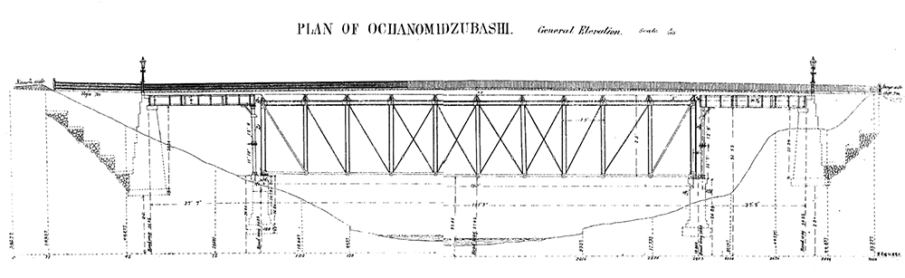 1889(明治22)年に日本初の都市計画である「東京市区改正条例」が発布され、神田川を渡る新橋が都市計画に位置づけられた。これを受け東京府は架橋事業に着手し、設計を経て1890(明治23)年11月27日に着工、1891(明治24)年10月15日に開通した。市区改正条例発布から時を置かずに事業着手が図られたことからも、いかにこの新橋が望まれたものだったかを推察できる。初代「お茶の水橋」は全長69.8m、幅員11.4mで3径間からなり、橋梁形式は、中央径間は支間長45.7mの錬鉄製のピン結合の上路プラットトラス橋、両径間は支間長10.8mの鈑桁からなっていた(❺、❻)。国内初の上路式トラス橋で、設計は東京府技師の原龍太が、監督は金井彦三郎が担った。橋台、橋脚と床版などの施工は清水建設の前身の清水組(清水満之助)が、鉄桁の製作と架設はIHIの前身の石川島平野造船所が請け負った。なお材料の鉄材は、ベルギーのライトメイヤー社で製造、輸入された。使用した鉄材の総重量は117トン、工事費は34,282円。神田川の渓谷をダイナミックに渡る「お茶の水橋」は、東京の新名所となり多くの見物人で賑わった。