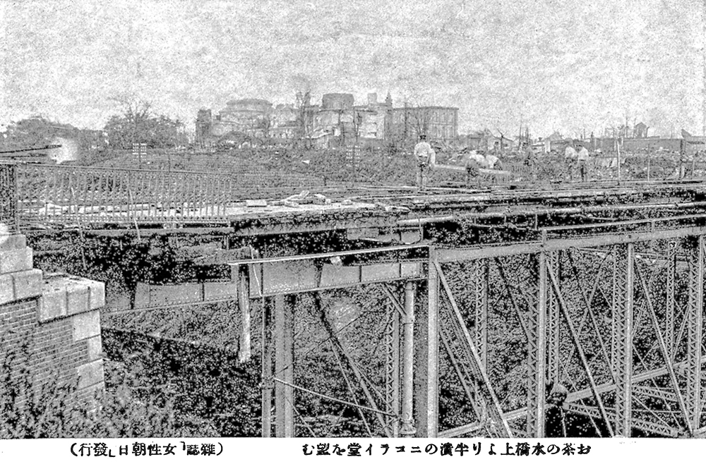 ❼ 1923(大正12)年の関東大震災で木造だった床版などを焼失した初代「お茶の水橋」の復旧状況。「お茶の水橋上より半潰のニコライ堂を望む」とある。(紅林所蔵)