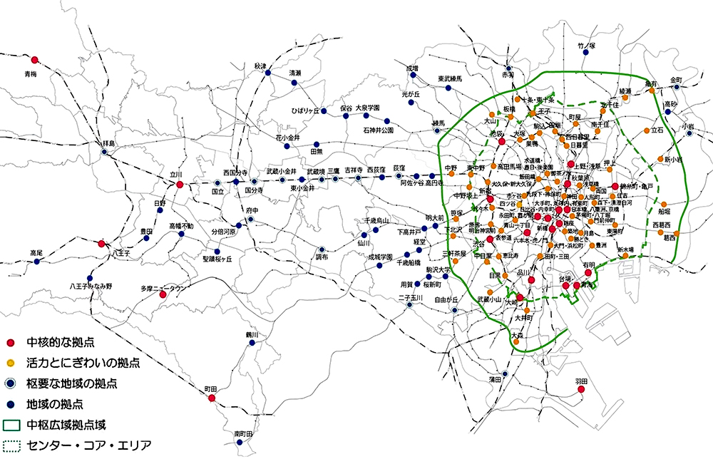 図① 東京都の拠点ネットワーク構造「中核的な拠点等のイメージ」
