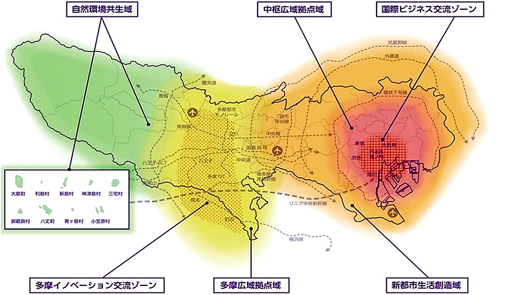 東京の都市づくりにおいては、共通的な地域特性をふまえ新たに示された地域区分(中枢広域拠点域、新都市生活創造域、多摩広域拠点域、自然環境共生域など、図②)に対応し、それぞれの地域区分ごとの将来像の実現に資するよう、土地利用の誘導方向が示される。