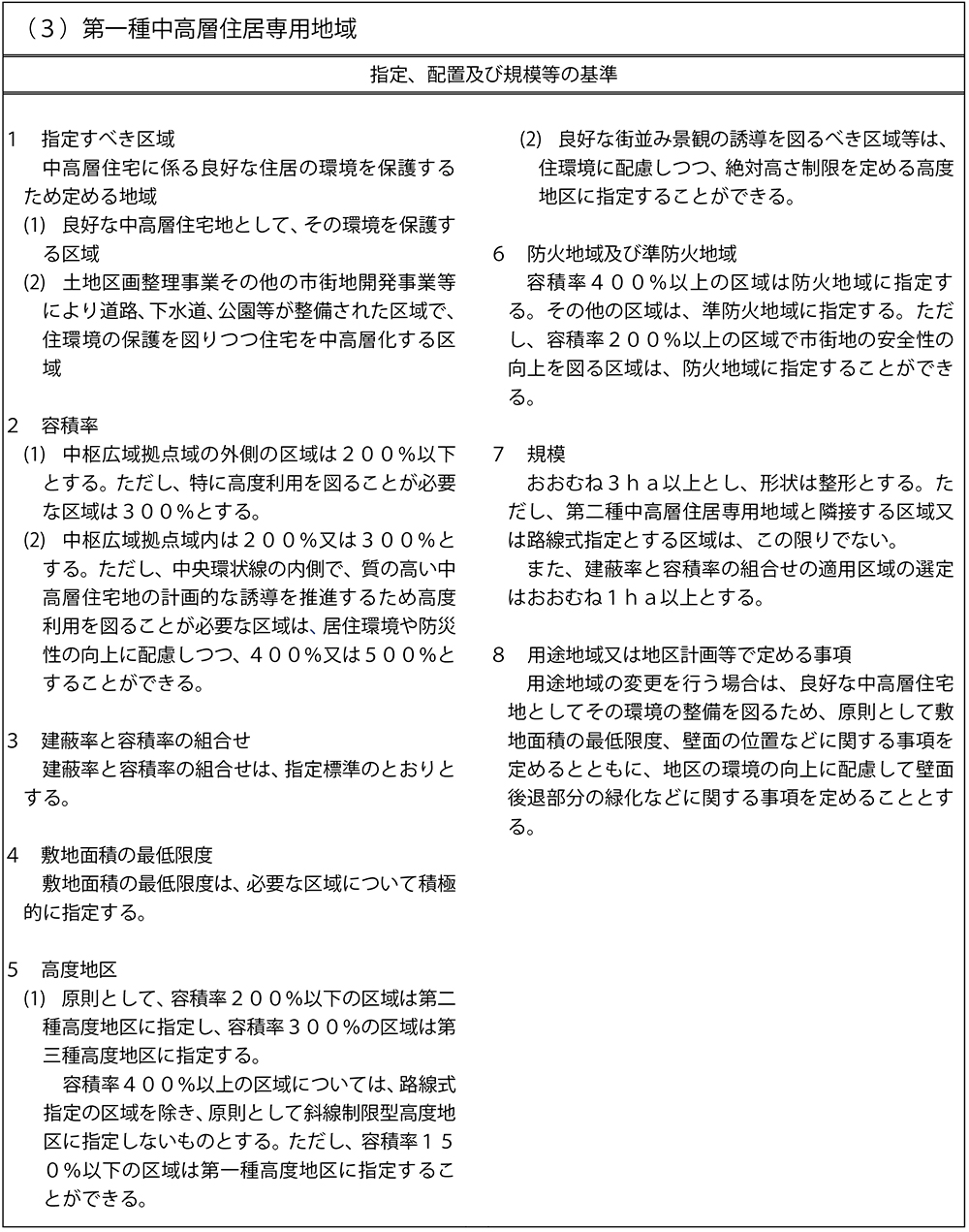 なお、ここでは紙面の関係から13種類の用途地域のうち、「第一種中高層住居専用地域(表①)」と「商業地域(表②)」にかかる指定基準を抜粋し掲示する。