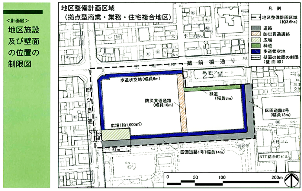 ・地区施設の整備:区画道路(幅員13-14m、延長100-260m)の整備、防災貫通通路(幅員10m、延長105m)の新設、緑道(8m)、広場(1,000㎡)等の整備。