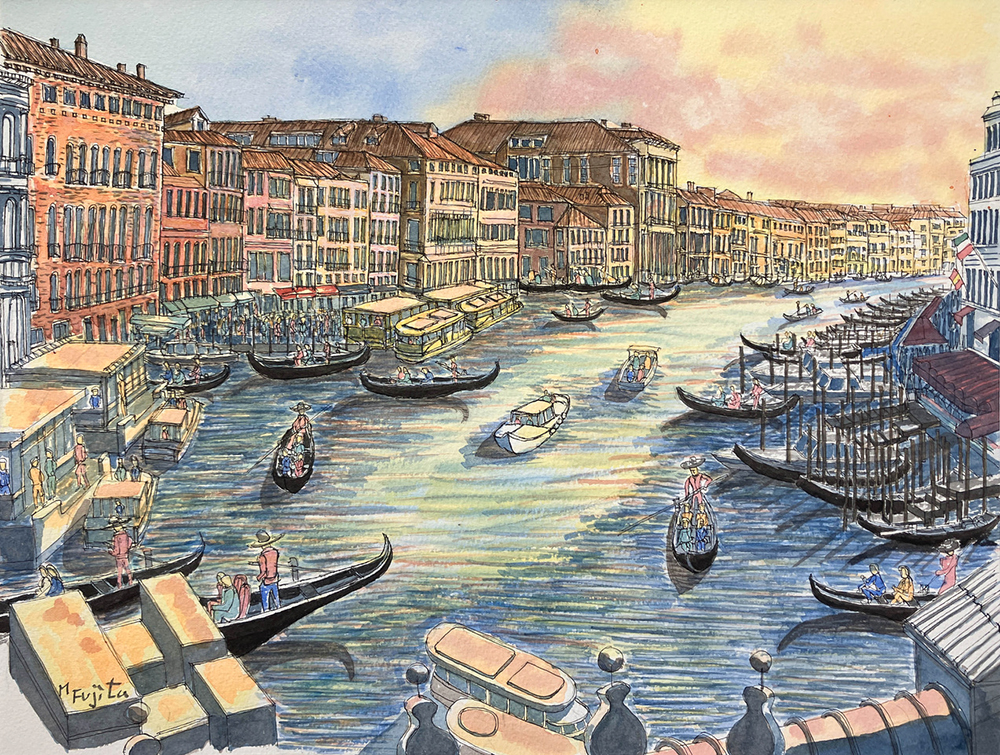 ベニスならではのゴンドラや水上バス、水上タクシーが盛んに移動しています。約三・八キロメートルにもおよぶベニスのメイン運河であるカナル・グランデ。ベニスの中心部を流れ、緩やかなS字の流れを描いているのが特徴。歴史的建造物が両岸に調和しながら建ち並ぶ様子は、まさにベニスならではの景色。
