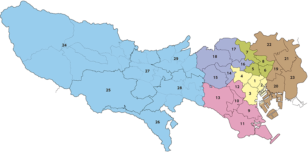 24 西多摩支部/25 八王子支部/26 町田支部/27 立川支部/28 南部支部/29 北部支部