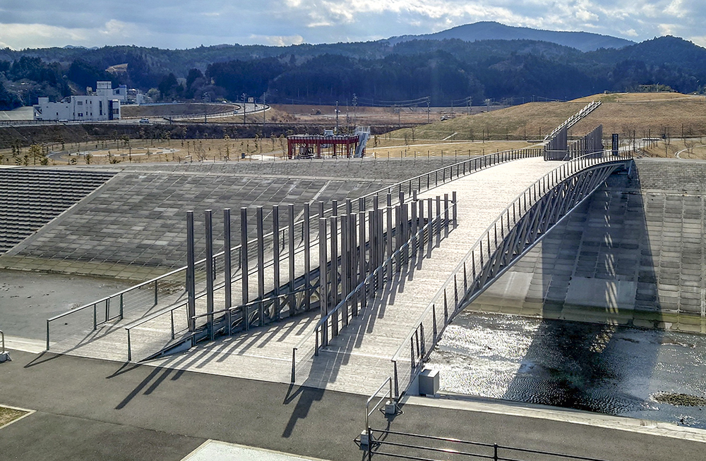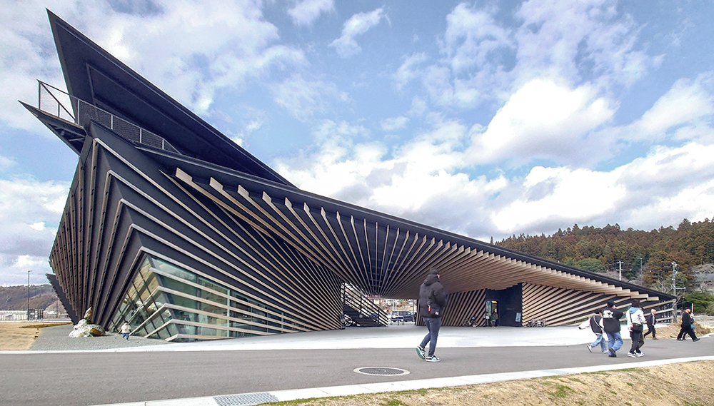「南三陸311メモリアル」(設計:隈研吾)は道の駅「さんさん南三陸」内にある震災伝承施設。東日本大震災の記憶と教訓を後世に伝えることを目的に、町民の声に耳を傾け、自然災害の記憶と向き合い、語り合い、学び合う場として整備された。館内は、町民の証言映像を視聴し「自分だったらどう行動するか」を考えるラーニングシアター、アートを通して震災の記憶に向き合うアートゾーン、町民の証言や写真・映像などを展示する展示ギャラリーで構成されている。震災の記憶を風化させず未来へと伝える貴重な学びの場である。外観はトンネルのような大きな門を思わせるデザインで、放射状に配されたスギのルーバーが門の中心に向かって吸い込まれるような印象を与える。展望デッキからは「中橋」越しに、「南三陸旧防災対策庁舎」のある南三陸町震災復興記念公園が望める。