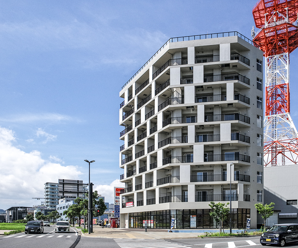 浦上川と稲佐山を望むロケーションに建つ集合住宅(2025年竣工)は、このツアーの幹事としても貢献してくれた台東支部のアーキテクチャーラボKONオフィスの今知亮さんの設計である。印象的な外壁デザインを構成するランダムな白い壁は、特殊な塗装を施し、空間を拡張する効果や西日対策としても機能している。