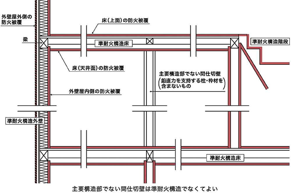 ・火災時に想定される柱・梁・壁・床等の加熱を受ける部分が隙間なく防火被覆材で覆われていること。