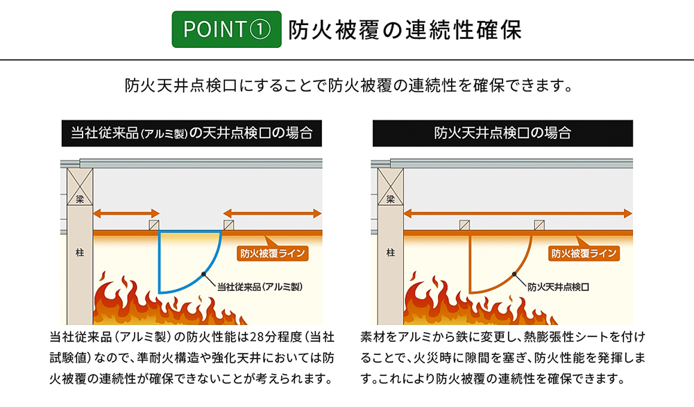 業界全体的に、天井点検口だけに関わらず、準耐火/耐火建築物に対する防耐火の連続性の意識が強くなってきている傾向があります。冬になると全国で火災のニュースが飛び交いますが、万が一の火災時に天井点検口部分が防火上の欠点とならないように、細かい部分ではありますが、住まい手、利用者の安心安全のためにぜひ「防火対応天井点検口」をご検討ください。