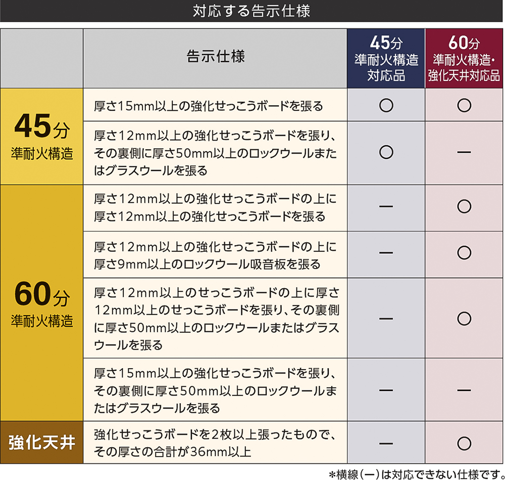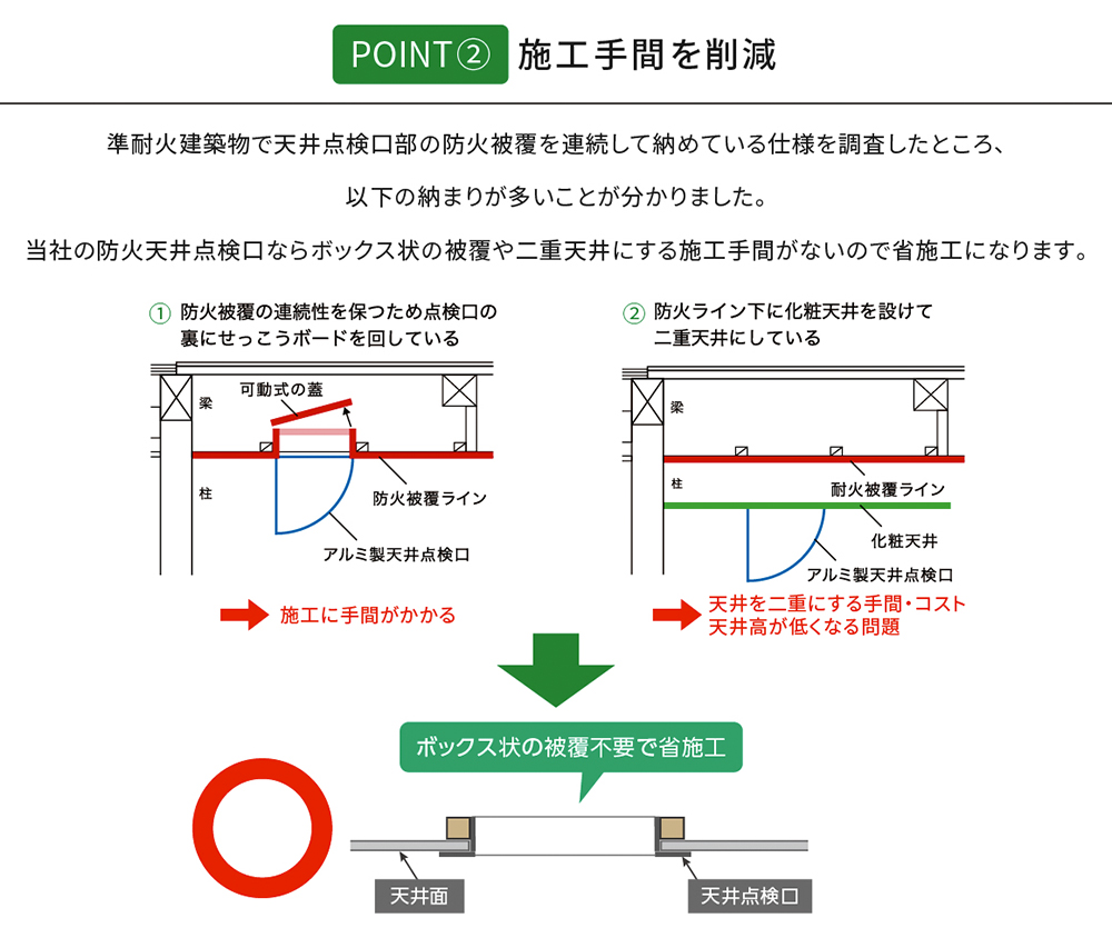 耐火建築物のように基本的に耐火被覆に穴を開けないという認識に比べ、準耐火建築物ではまだまだ曖昧でわかりにくいところが多いのが現状です。開口部の納まりがわかりにくい準耐火構造ですが、せっこうボードを切り欠く必要がある部位の中でも、特に大きく切り欠く必要があるのが天井点検口です。「アルミ製だと性能が足りないのでは?」、「何か措置は必要?」、「性能確保のための現場措置がわかりにくいし手間がかかる」、「認定品もないし、どういったもので納めればよいかわかりにくい」など、性能上、施工上のさまざまなお困りごとが存在していました。