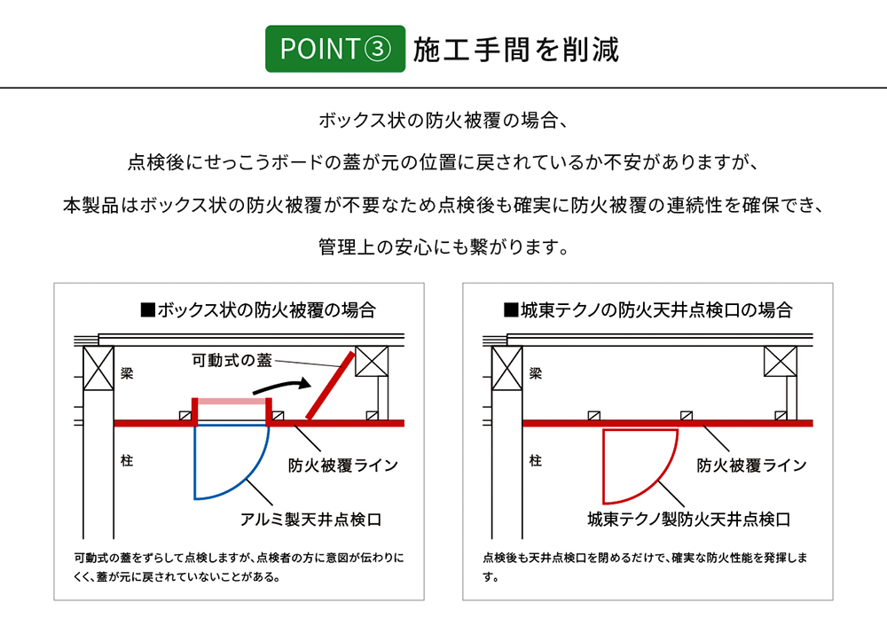 特に非住宅物件やアパートでは天井に何十カ所と点検口を設置しますので、その部分の性能が足りなければ必然的に建物の欠点が増えます。そのため、天井の防火被覆の連続性を途切れさせないための措置が必要となります。城東テクノの防火対応天井点検口はその措置のひとつです。