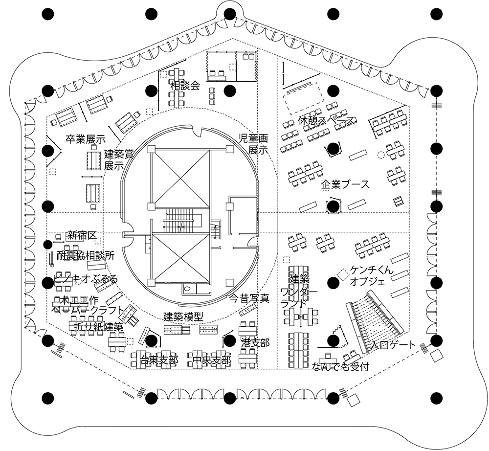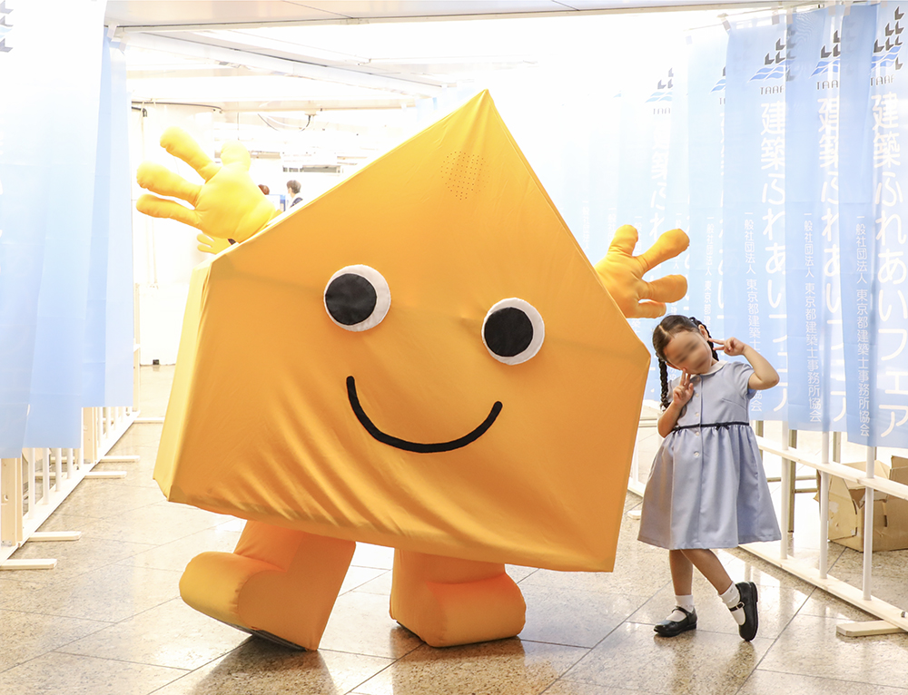 会員事務所の建築士がリフォームや耐震、省エネなどさまざまな相談に親身に対応し、来場者から信頼を集めていた。今年はステージイベントの規模を縮小したが、各支部や団体のワークショップが盛況であった。入場ゲートは幟を連ねたお祭り風のデザインで、ケンチくんの撮影会も映える配置となった。会場の気温対策として冷風機を設置し、ペットボトルの分別廃棄などSDGsを意識した運営も行われた。