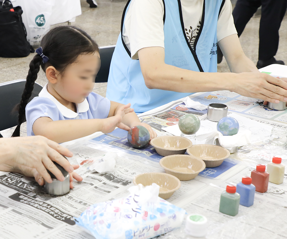 地球のような色付けを行い、ビンなどで丁寧に磨きをかけて、つやつやの泥だんごをつくるコーナー。泥だんごにだんだんつやが出てくると、来場者の皆さんも作業に熱が入り、会場は大いに盛り上がっていた。