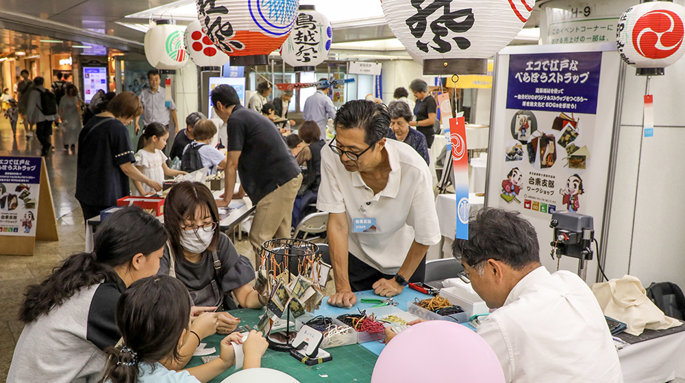 建築端材でオリジナルストラップをつくるコーナー。今までの建築端材に加えて、今年のNHK大河ドラマ「べらぼう」の主人公、蔦屋重三郎のキャラクターも加えてマスコットをつくる趣向。今年は各町内の提灯が会場に提げられ、三社祭りの提灯もあれば、吉原の提灯もあり、江戸情緒豊かなブースとなっていた。