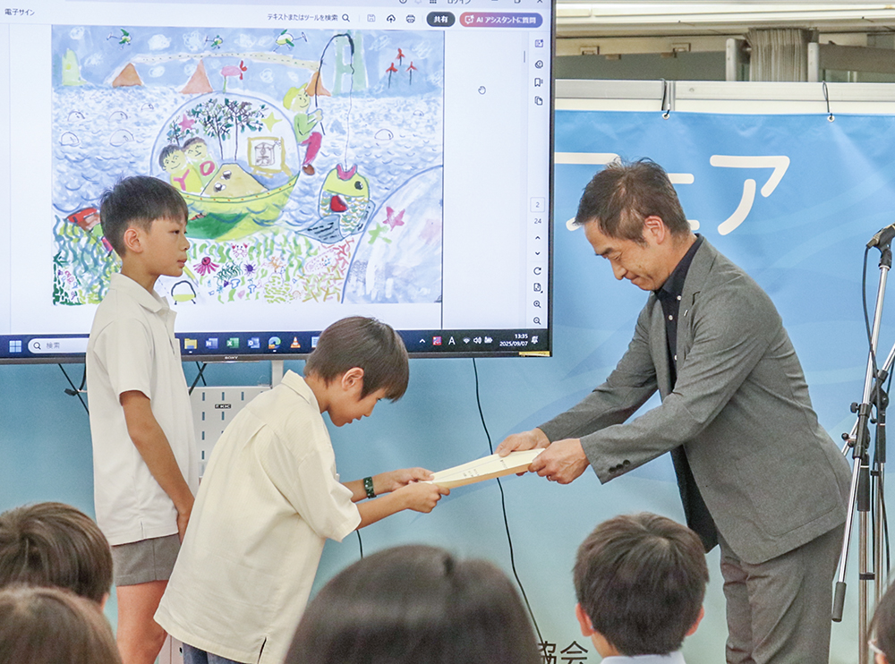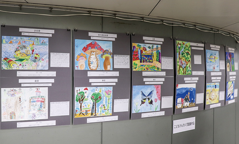 その他、金賞は2作品で長友成志レックスさん(小学4年生)の「生きものあふれる ろかハウス」と、小菅巴哉斗さん(小学4年生)の「レインボーランド」。銀賞は3作品で臼井健悟さん(小学4年生)の「海の中のゴミをへらし「うれしい」をふやす家」、師岡美月さん(小学5年生)の「遊びにきてね、海のまち」と、会田光杏さん(小学2年生)の「しぜんにやさしい空気としあわせの木」。銅賞は5作品で郭絢稀さん(小学3年生)の「ふしぎな貝の家」、鈴木海翔さん(小学4年生)の「空を翔る未来都市」、小塊万柚子さん(小学4年生)の「地球にやさしいカラスあげはちょうハウス」、若宮舞佳さん(小学2年生)の「わたしのすみたい島」と、稲葉さえさん(小学2年生)の「しぜんの町」が表彰された。表彰式の後に受賞者とケンチくんの記念撮影で結びとなった。みなさん、おめでとうございます。