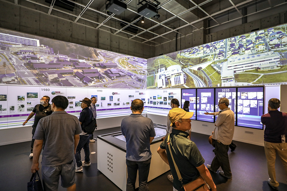 1階の「URシアター」では、URの業績、変遷がスクリーン4面に映し出されている。