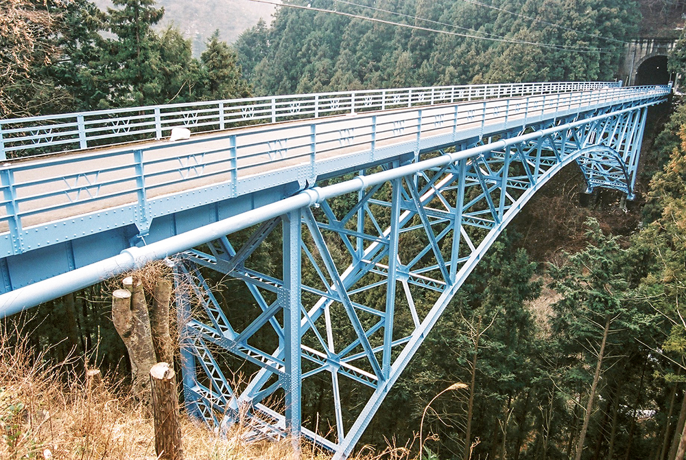 アーチが鋼製のトラス構造でつくられた中路式ブレストリブアーチ橋。一見タイドアーチ橋に見えるが、支承はアーチ軸線の延長上に設置され、強固な岩盤でアーチ反力をとっている。中路式のアーチ橋では建設時に国内最長を誇った。恐竜を彷彿させるような重厚なフォルムが特徴。橋門構の紅葉の飾りは、平成初めの修景事業で設置されたもの。