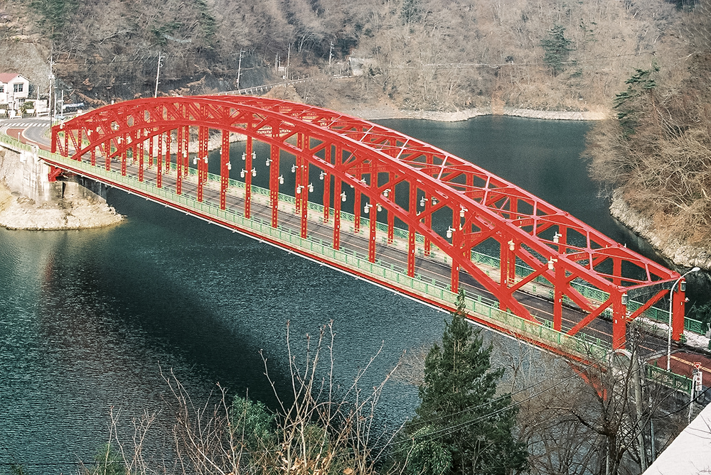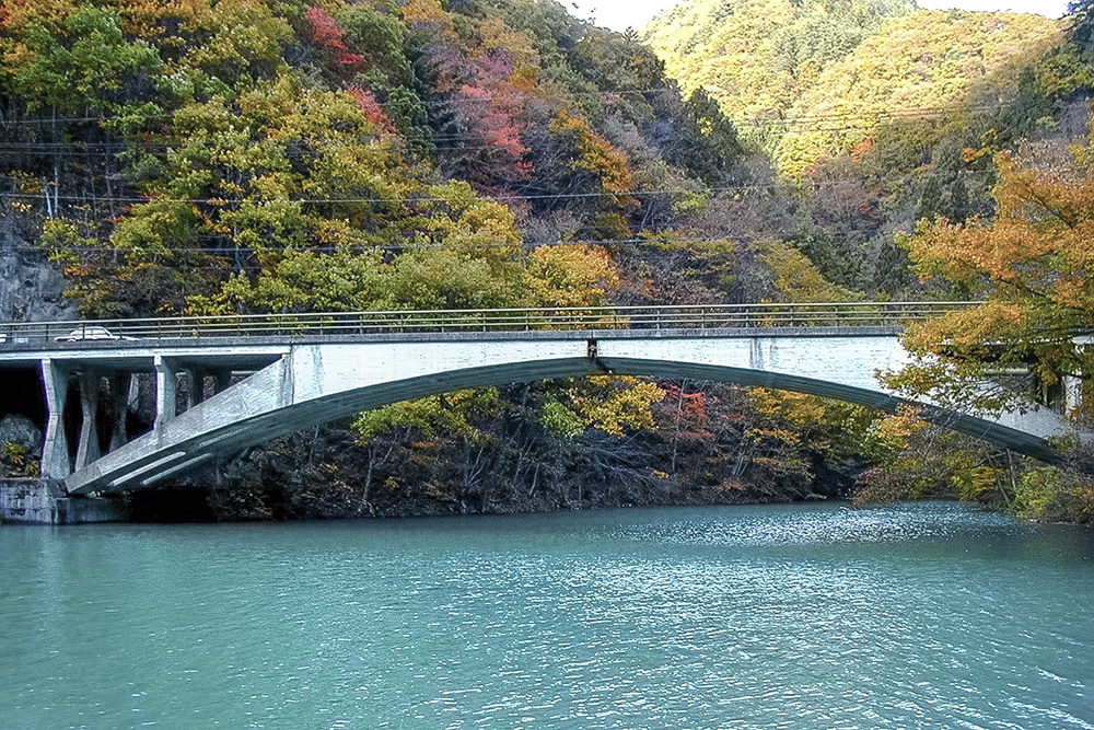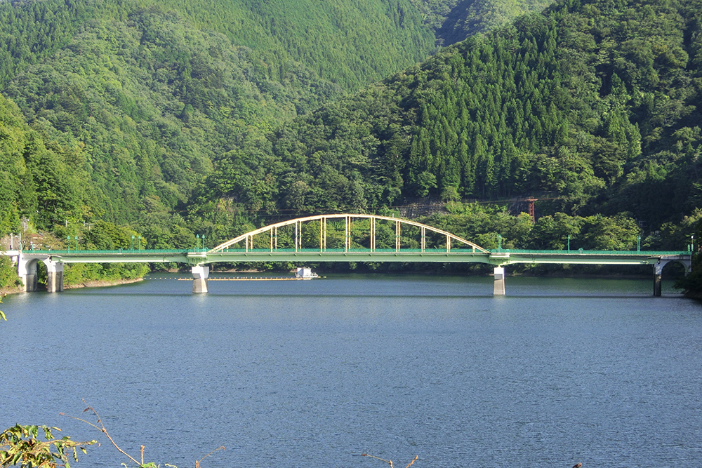 「ここは本当に東京都?」そんな声が聞こえてきそうな、深い山々に囲まれ満々と水を湛えた湖、奥多摩湖。この湖は多摩川を堰き止め建設された小河内ダムにより誕生した広さ1,150haの人造湖である。ここは知られざる橋の名所でもある。ダムの工事は、戦前の1936(昭和11)年に着手されたが、建設に伴い小河内村の大半、約1,000軒が水没することから住民の反対運動が起き、これを第1回芥川賞作家の石川達三が小説『日蔭の村』で描いたことから社会問題化し、さらに太平洋戦争に伴う工事中断もあり、着工から19年を経て1957(昭和32)年にようやく完成した。ダムの堰堤高は149mで、国内最大、世界でも米国のフーバーダムに次ぐ世界第2位という巨大ダムであった。
