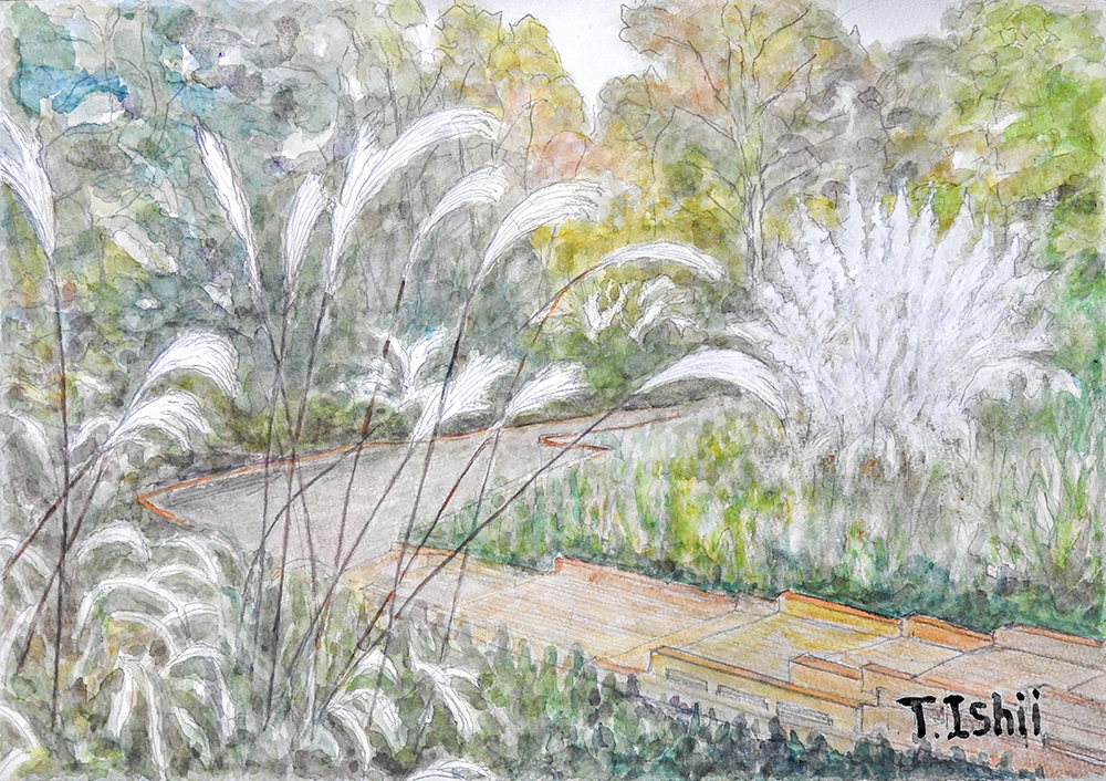 木橋と木道が連なるハスやスイレンが咲く池とワサビ畑を抜け、ススキとパンパスが生い茂るこの場所に腰を下ろし画材を出しスケッチ画を描き始めました。