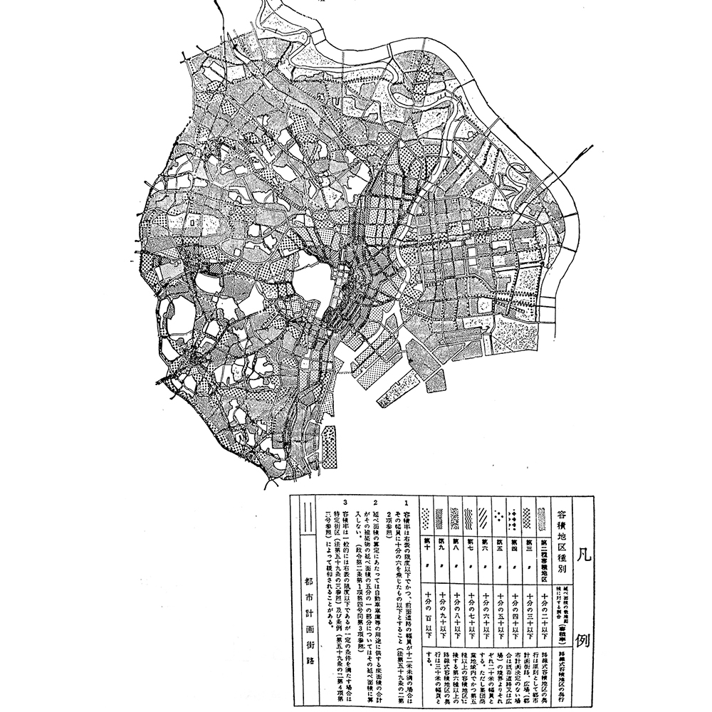 このような経緯をふまえ容積地区による容積率規制は、その後、1968(昭和43)年制定の「新都市計画法」(「建築基準法」は1970/昭和45年改正)において、建蔽率規制とともに「用途地域制度」の中に組み入れられ、用途規制と建蔽率規制、容積率規制等(高さ規制含む)がセットになって、全国展開することになる。