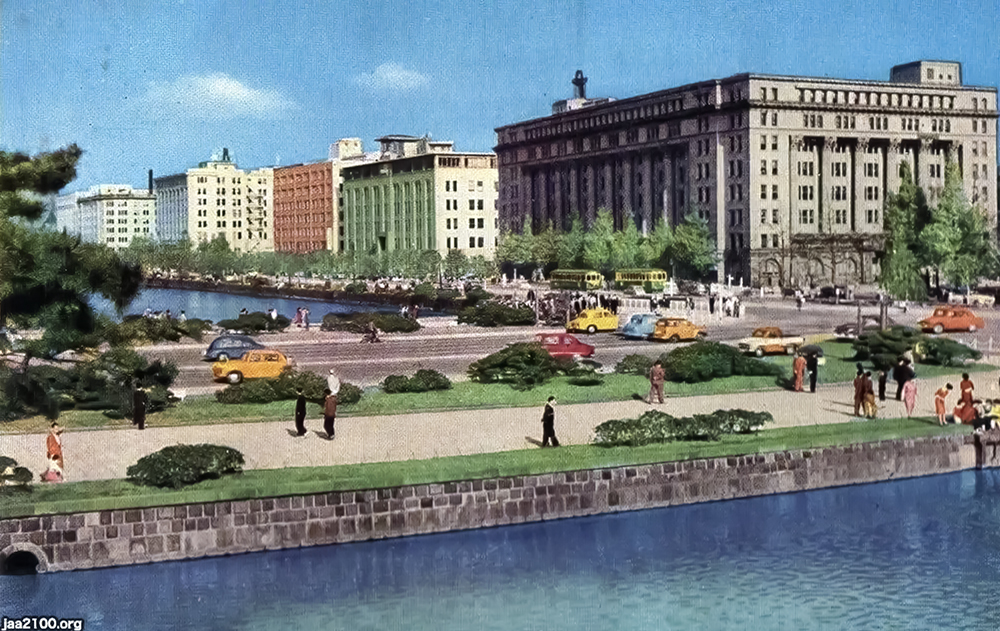 そして、ようやく決着に向け、関係者間で仲裁の動きが出てくる。その結果、「高さは100m以内とする」ことになり、かつ当時、工事中であった皇居新宮殿のお立ち台(視点場)から、この東京海上ビルを眺める際の仰角(写真❹)を、今後は行政指導の基準とする。」ということになった。こうして計画公表から決着まで、足かけ4年、丸3年にわたった騒動は、ようやく決着する。
