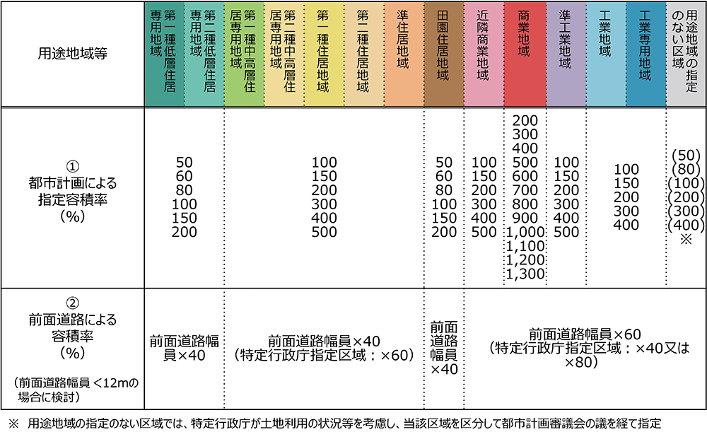 次に、容積率規制にあたっての具体の規制値であるが、わが国においては、現在、都市計画として50%から1,300%まで17種類の容積率メニューが用意されていて(表①)、当該都市の土地利用計画に即し、市街を構成する各地区にふさわしく、用途地域の種別に応じ一定のメニューを選択し指定することになっている。