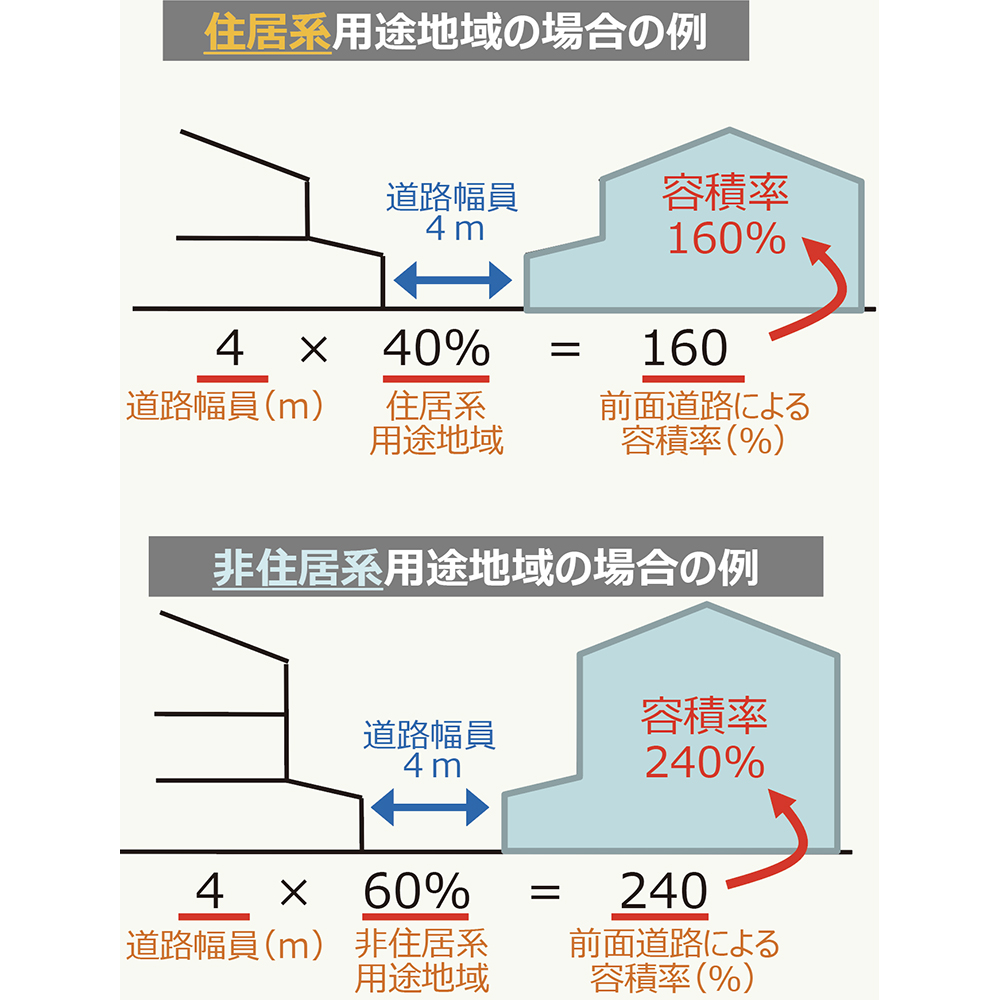 前面道路の幅員が12m未満の場合、前面道路の幅員に用途地域による係数(40%又は60%)を乗じて容積率の上限を算出する。