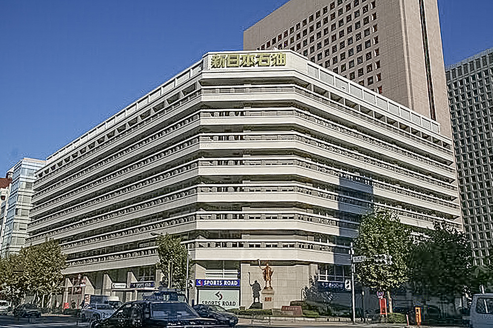 このビル建て替えをみると、時代の移り変わり(法規制の変化)がよくわかる。すなわち、従前のビル(地上9階地下4階、延べ面積約53,000㎡、写真❼)は絶対高さ31m制限下の1962年に建設され、敷地いっぱいに広がりずんぐりとした形態を呈していたが、従後のビル(下記、「計画概要」参照、写真❽)はプラザ&タワー型の高層建築物となり、耐震性能・環境性能を高めるとともに、足元周りに公開空地を配置するすっきりとした形態を呈している。新しく生み出された公開空地には植栽がなされ、沿道の街路樹と連続し歩行者に快適に回遊空間を提供している。