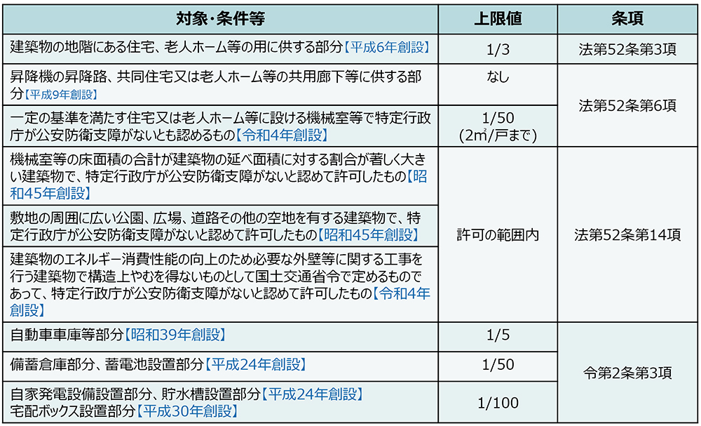 ⑩「高齢者等の移動円滑化法」(バリアフリー新法、同法19、令24)の認定特定建築物において、通常のものを超えて付加された部分の床面積は、建築基準法52.14.1に規定する建築物とみなし、同規定が適用される(延べ面積の1/10以内であれば床面積に参入しない)。「建築物のエネルギー消費性能の向上等に関する法律」(建築物省エネ法)に基づく認定建築物において、建築物エネルギー消費性能誘導基準に適合させるための措置をとることにより、通常の建築物の床面積を超えることとなる部分は、延べ面積の1/10以内であれば床面積に算入しない(同法40.1、令7.1)。