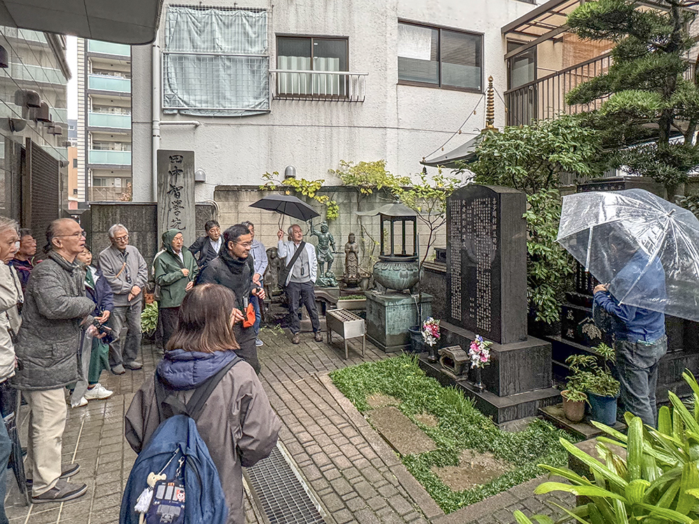 花川戸の区民会館から、浮世絵の元となる歌舞伎ゆかりの旧・猿若町を通り、暗渠化されたかつての山谷堀の上に整備された山谷堀公園を経て、蔦屋重三郎の墓碑のある「正法寺」へ。