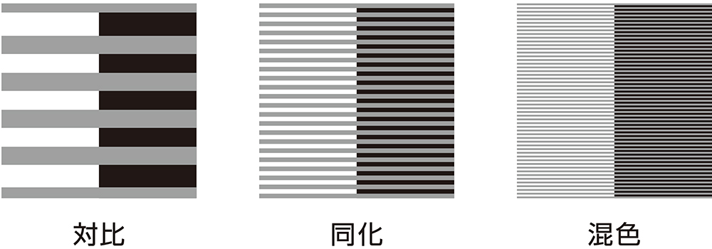 色の見え方には3つある。色がぶつかり合って相対立するのが対比、どちらかの色に影響されるのが同化、溶け込んで新たな色になるのが混色である。