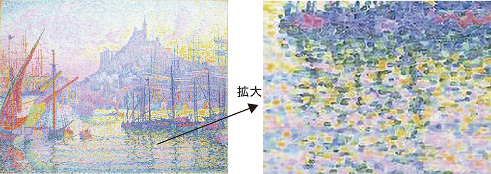 ポール・シャニック(仏、1863~1935)の点描画。点描は1点1点の色がバラバラに配置されているが、離れて見ると色が平均化され、混色された色として認識する。テレビの画面や印刷物の網点もこの原理を利用している。拡大