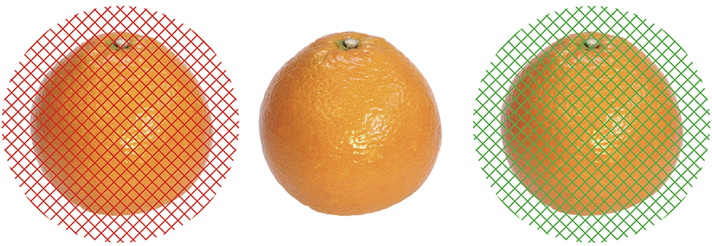 みかんに赤のネットを重ねると赤味を増す。