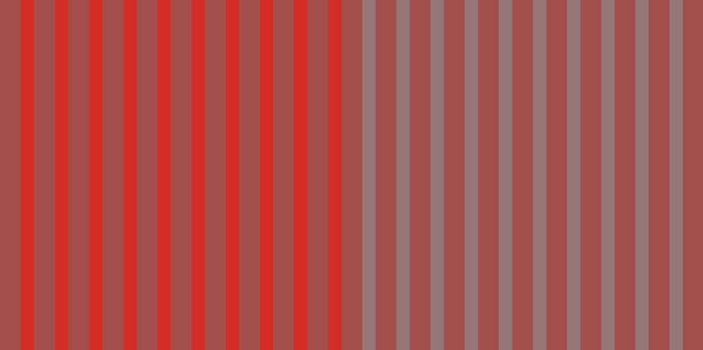 白と赤の面積もあり間隔があれば色味ははっきり見える、これを対比という。