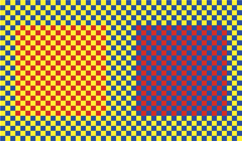 脳は視野の各部分をまとめてひとつの画面として認識しようとします。これを空間的統合といいます。部分の色を統合し全体的な色として理解します。それぞれがひとつの色ではなく統合し平均化した色として認識することになります。この原理は種々の錯視を生む原因ともなっています。