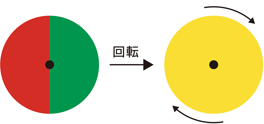 赤と緑のコマを回転させると黄色になる。 高速に色が混ざり合う同化で「継時混色」ともいう。