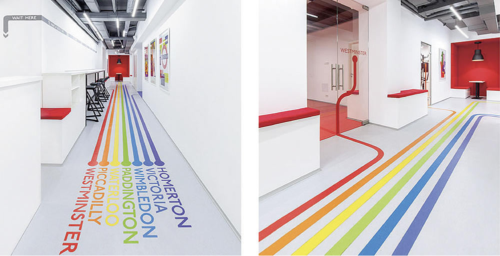 この導線にセパレートが応用されています。色で移動ルートを強調し、分かりやすく案内誘導するために色をセパレートします。病院の床に赤=救急導線、緑=外来通路、青=会計導線などによって差別化します。(図❹–1、2)