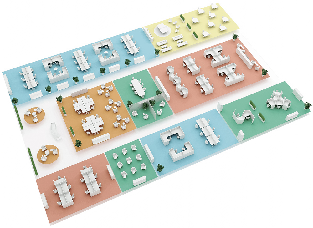 働く環境が生産性と士気に直接影響を与える。オープンスペースでは空間の意識が曖昧になる。それを考慮してエリアを色で明確化する。