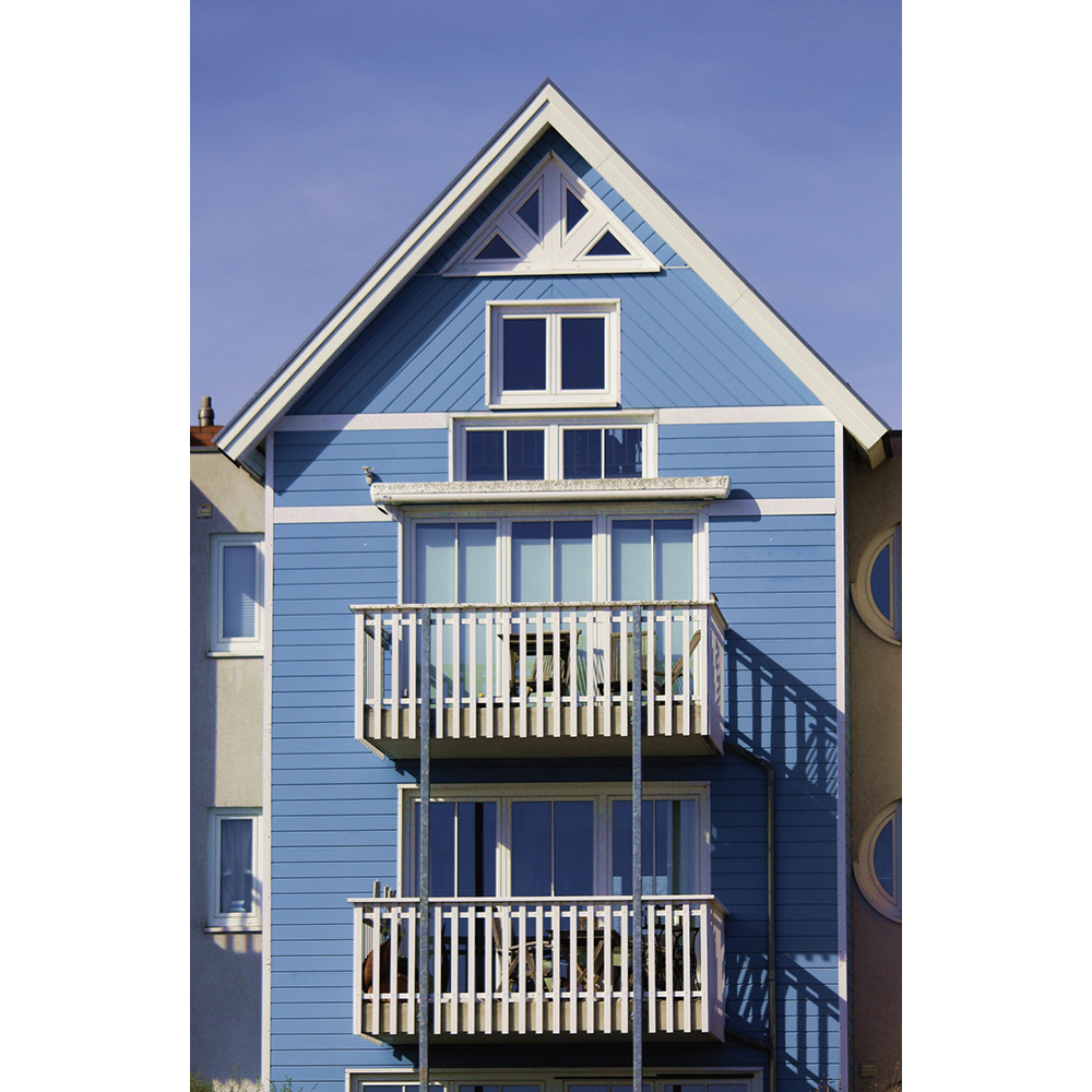 青い壁面は空に溶け込んでしまうが、白の輪郭でセパレートすることで建物がくっきり見える。