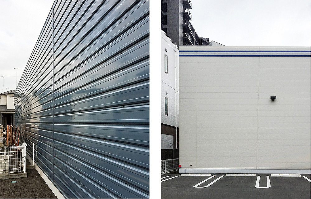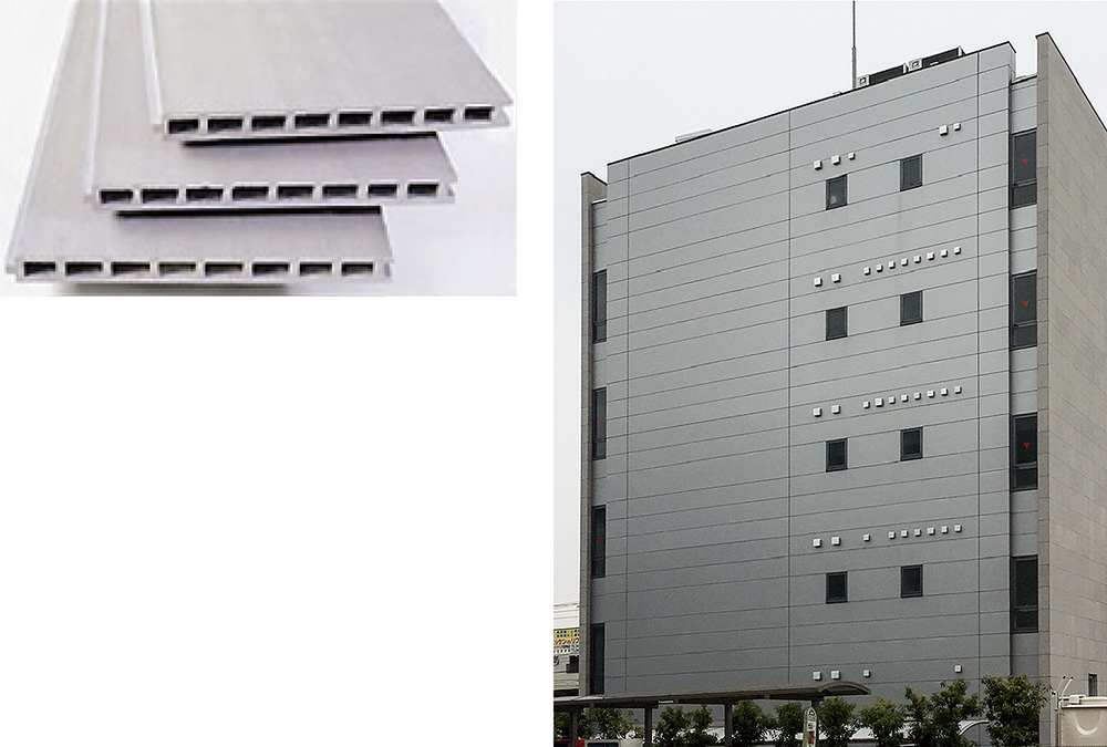 押出成形セメント板(左) *3と施工事例(撮影:筆者)。
