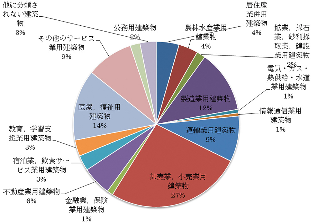 半数を占めている運輸・製造・卸売業では、建築規模・コスト・工期などの要因により主に鉄骨造で乾式外壁材を採用しており、ALC、ECP、金属パネル、塗装鋼板などを採用することが多くなっています。この場合、イニシャルコストが最優先で、耐久性や維持管理を考慮した仕上げ材が採用されることは多くはありません。また、箱形の建築物が多く、意匠的にもデザイン性を表現することが難しいことも要因として挙げられます。