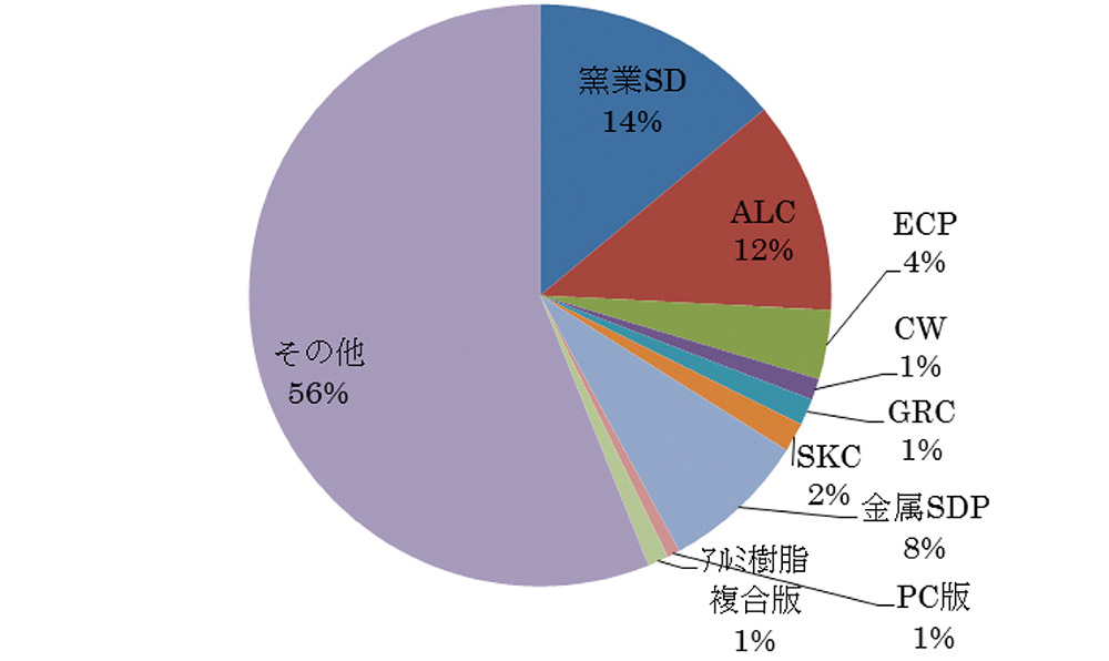 RC造を除く非住宅における建築の市場規模を反映した分布では、統計資料が抽出できない「その他」の部分が半数以上を占めています。建築着工面積からもうかがえるように、工場・倉庫・農林水産系の着工面積が占める部分に類似しており、調査によると金属系仕上げ材がそのほとんどを占めていることが推定されます。また、用途・耐火性能・設備等を鑑みて経済的な建築物が多いことから、意外にも住宅用と考えられている窯業系サイディングが多く採用されていることが分かります。