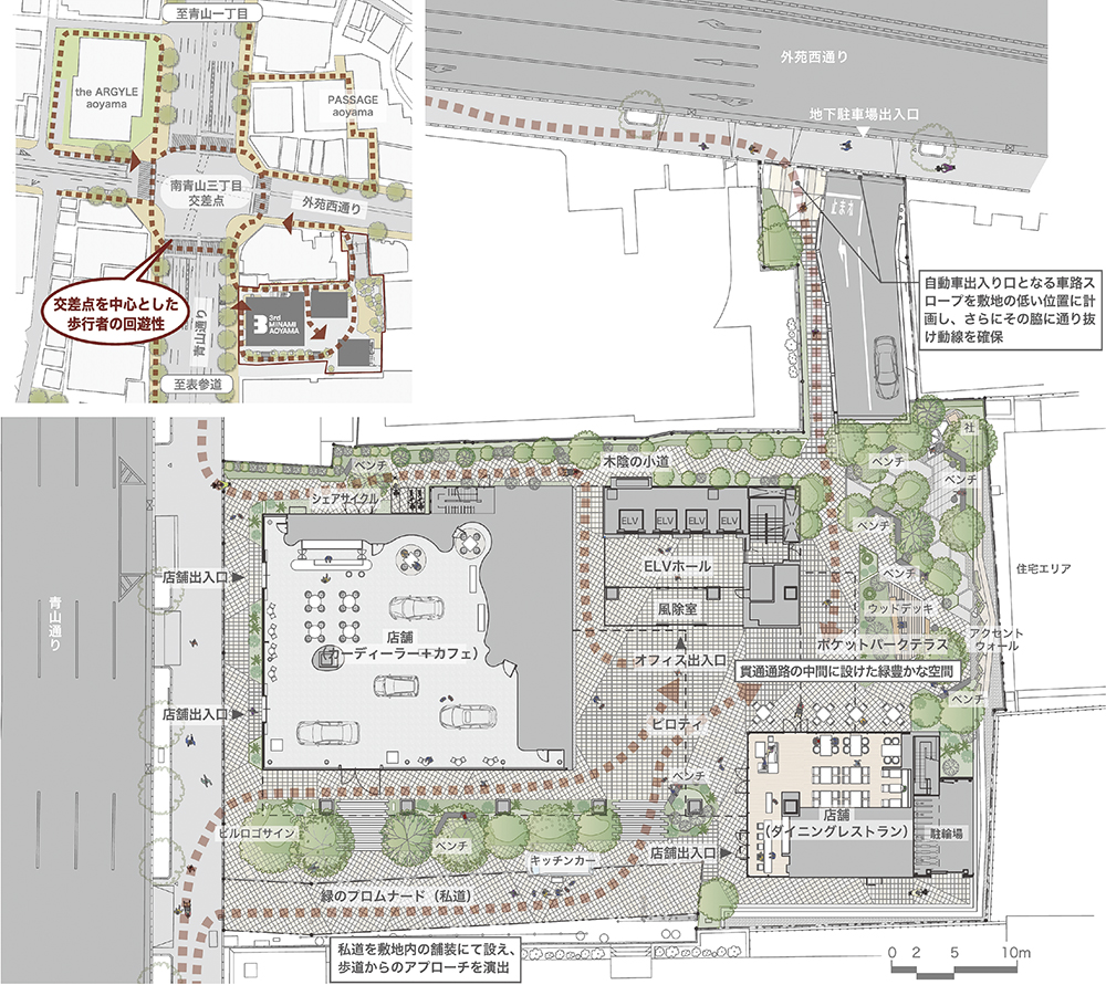 計画敷地は、大規模開発が進む大通りに面し、商業地域と住居地域を跨いで位置する。青山エリアでは、表通りから一本小路へ入ると、住宅地のスケール感を併せ持つ街区構造により、ブティック、庭先の植栽等、街の小刻みなシークエンスを楽しめる。また、計画敷地に従前あった既存建物は、低層階にスーパー、上層階に公団住宅といった用途の建物だったことから読み取れるように、元来ヒューマンスケールを備えた敷地である。本計画では表通り(都市スケール・商業地域)と小路(ヒューマンスケール・住居地域)により生まれる都市の二面性こそが、本敷地が持つ魅力(敷地の固有性)と捉え、これを引き出していく建築・ランドスケープデザインを目指した。(梶 隆之、本田 輝明、芥 隆之介)