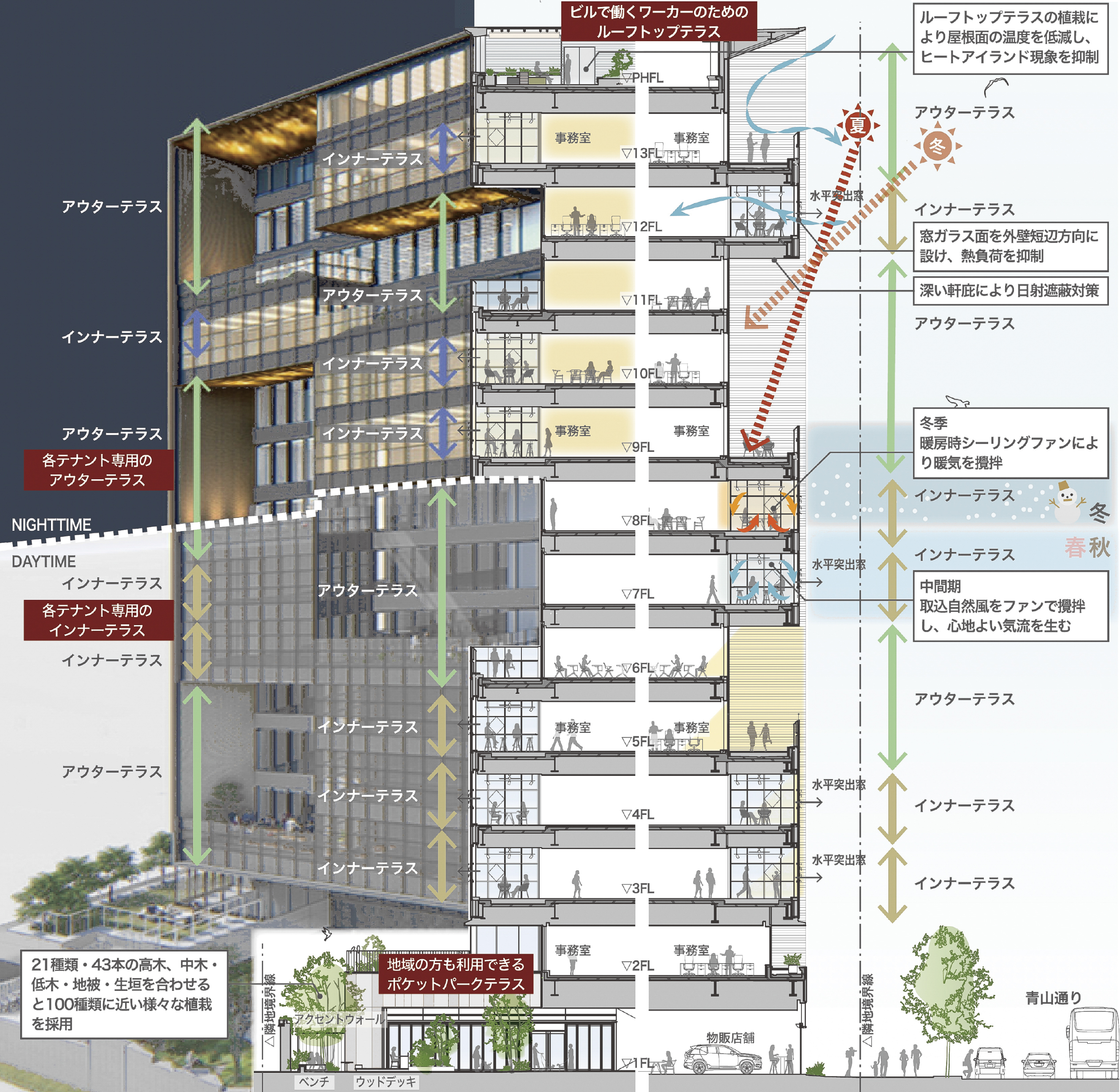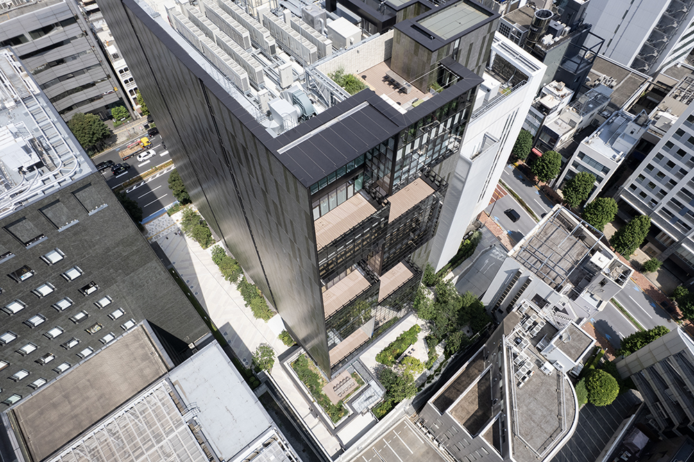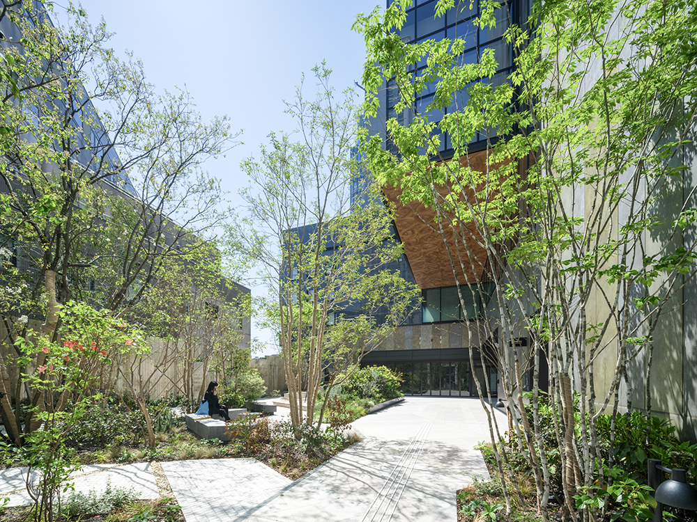 テナントオフィスビルという通常であれば、効率のみを優先することに陥りがちなビルディングタイプにおいて、アウターテラスやポケットパークなどの新しい価値を挿入させた点を高く評価した。まず1階にふたつの大通りを繋ぐ貫通通路を整備しているのが素晴らしい。貫通通路に緑豊かなポケットパークを設けることで、オフィスを使わない人にも街を回遊する楽しさを提供している。オフィスエントランスを前面道路ではなく、貫通通路の途中に設けているのは、路面の店舗にとってもプラスであるし、オフィスで働く人びとにとってもプラスになっているのが感じられる。ポケットパークに隣接したレストランも路面店のような趣を備え、貫通通路をより豊かなものとしている。そして何よりもこのビルを特徴づけているのは、オフィス階に2層吹き抜けのアウターテラスを設けていることである。アウターテラスは、高層階で働く人にとって憩いの場となるだけでなく、街の風景を豊かなものにしている。オフィスへの熱負荷を軽減するのにも役立っている。アウターテラスに隣接するインナーテラスの窓が開閉可能で、自然通風が可能となっているのも良い。今後のテナントビルのプロトタイプにもなり得るプロジェクトである。(手塚 由比)