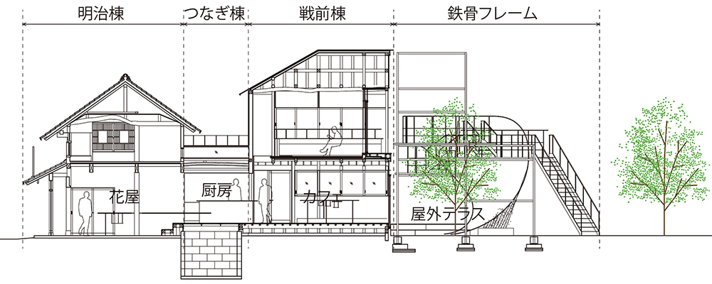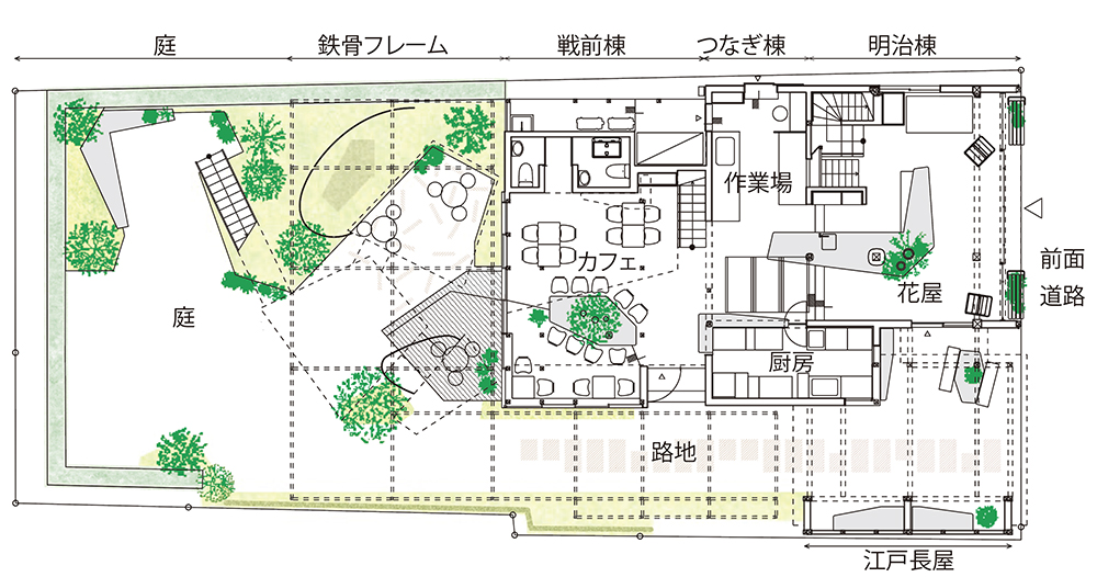 新たに加えるエレメントは全体を横断するように配置することで、新旧や屋内外、人と植物を連鎖的につなぐことを考えた。骨格としての「律」が空間のベースにあることで、エレメントやアクティビティが変化していくことを受容し、変化し続ける生きた建築となることを目指した。(高野 洋平、森田 祥子)
