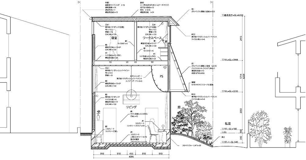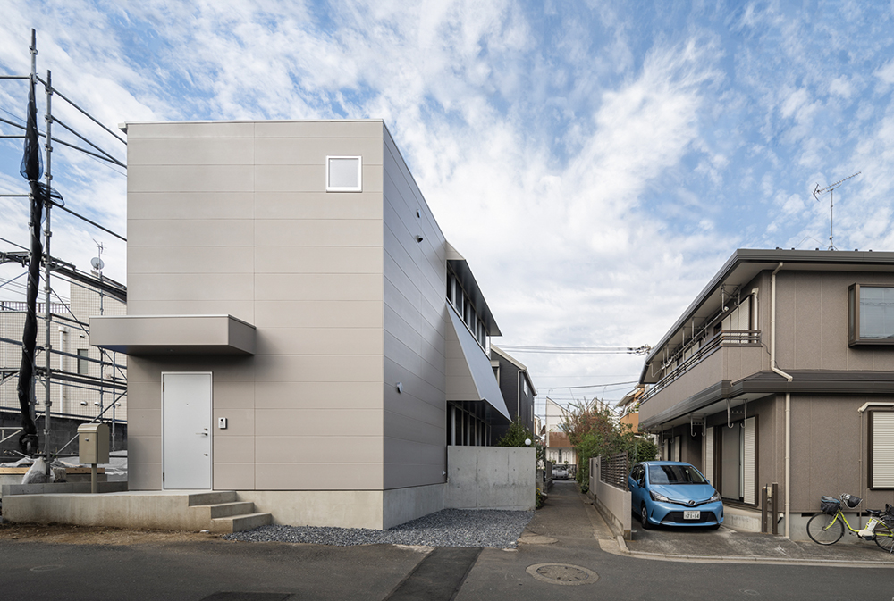 武蔵野台地に広がる典型的な東京の住宅地に建つ、若い夫婦と子どもひとりのための住宅。敷地は比較的人通りのある前面道路と幅2mに満たない私道に面している。接道側は特徴がない一方で、私道側では周辺の住宅が庭をつくり植物を育てることで、親密な雰囲気が生まれている。そこでこの家の「ファサード」を前面道路ではなく私道側にずらし、庭をつくって窓を設けることで路地の雰囲気に貢献することにした。南側の隣地は空き地だったため、開口を高窓に限定して将来の不確定要素の影響を軽減している。